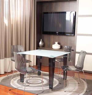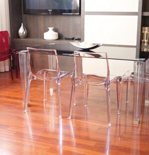 Infine, anche in confronto alle semplici sedie dotate di gambe metalliche e con seduta realizzata in acrilico termoformato, la efficienza e la velocità raggiunte dalla produzione di GRANDSOLEIL, realizzata in policarbonato, hanno portato i costi di quest’ultimo significativamente vicini a quelli del metacrilato, fornendo un prodotto che, tuttavia, è strutturalmente più robusto, sia come capacità di sopportare pressione e peso, sia in termini di resistenza all’urto. Ciò, poiché il metacrilato, specie se è stato termoformato in modo significativo, e forato, si comporta in modo fragile, talvolta in modo impredicibile, specialmente sotto l’azione di una forza d’urto.Accanto a ciò il policarbonato ha una maggiore trasparenza del metacrilato (che non è mai trasparente quanto i vetri silicei). Ciò è vero soprattutto nella versione non colorata, laddove il metacrilato mostra un residuo giallo di fondo che non può essere totalmente rimosso. In ogni modo, il confronto con il metacrilato deve essere necessariamente ristretto a pochi esempi, perchè il metacrilato può essere utilizzato solo per semplici sedute, a causa delle limitazioni del processo di termoformatura da lastra piana, piuttosto che per sedie complete, che, al contrario, rappresentano la vera possibilità del policarbonato, grazie alla tecnologia degli stampi ad iniezione a gas. Il policarbonato rende libero il design della sedia.Ultimo, ma non minore dettaglio, la introduzione, accanto al policarbonato, di tecnopolimeri innovativi, derivati dal polipropilene (IGAP ha registrato questi materiali con il trademark di ed ) darà ai nostri clienti la possibilità di commercializzare sedie con una superficie brillante e high glossy , che imitano perfettamente, dal punto di vista visivo, la superficie in policarbonato, nella versione lucida, ma sono caratterizzate da un livello di prezzo, nel range UPON, molto vicino a quello delle sedie in polipropilene standard. GRANDSOLEIL sta rendendo la cosa possibile, passo dopo passo, anche per sedie molto leggere e strutturalmente complesse, incluse, nel futuro prossimo anche le sedie con gambe metalliche cromate.Anche questa risulterà una innovazione significativa per il mercato, poiché le superfici brillanti ed ultralucide rappresentano al presente, e nel prossimo futuro, un trend di sicuro successo, soprattutto per il pubblico dei giovani consumatori.